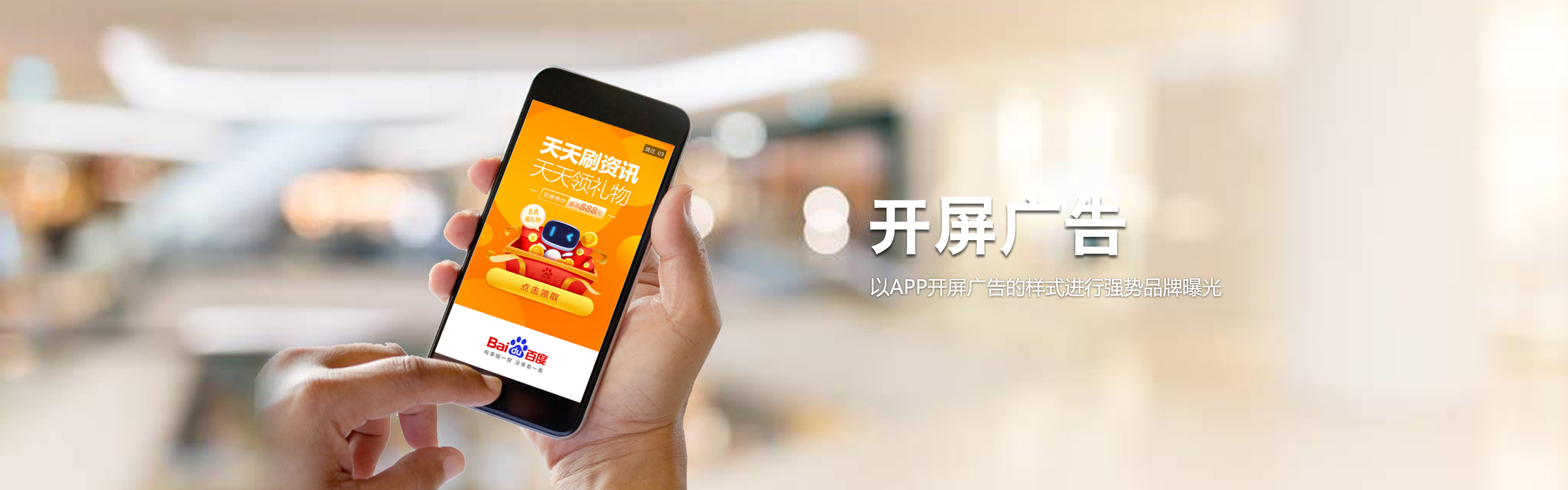 百度開屏整合百度優(yōu)質(zhì)品牌廣告流量 以APP開屏廣告的樣式進(jìn)行強(qiáng)勢品牌曝光
